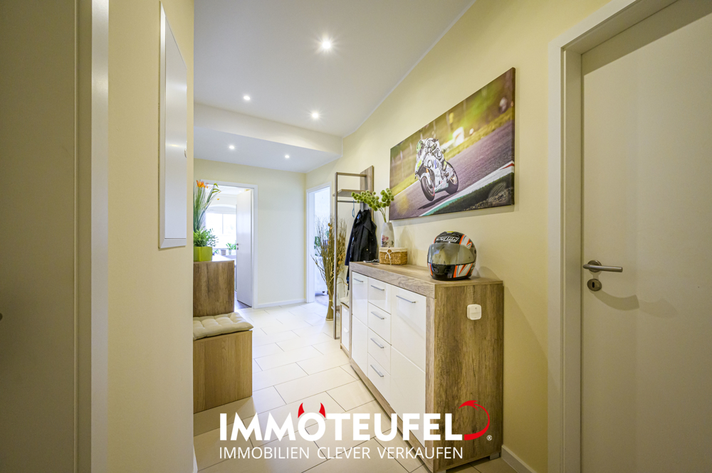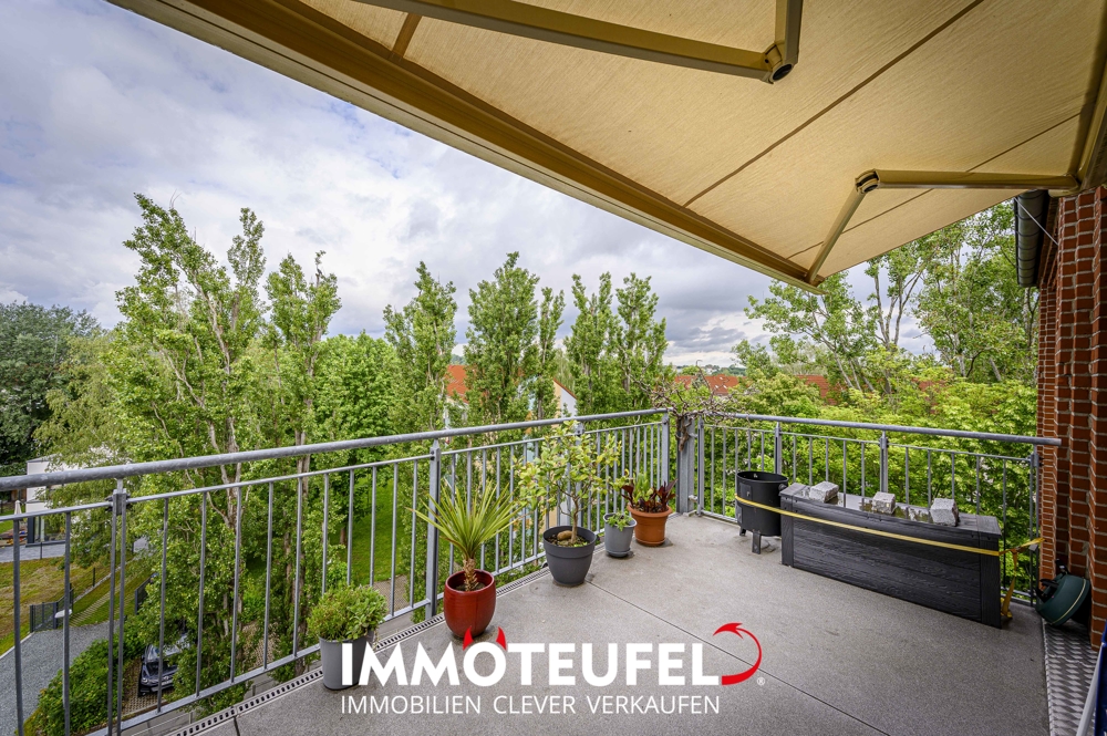 Über zwei Flügeltüren gelangen Sie auf den rund 18 m² großen Süd/Westbalkon – ein echtes Highlight mit freiem Ausblick. Eine elektrische Markise spendet Schatten und erlaubt den Aufenthalt im Freien selbst an sonnigen Tagen.