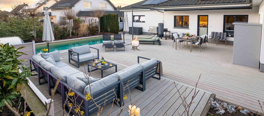 Ein absolutes Highlight der Immobilie stellt die außergewöhnlich großzügige, etwa 80 m² große Terrasse dar. Sie wurde hochwertig ausgestattet und bietet weit mehr als eine klassische Außenfläche: elektrisch gesteuerte Markisen, integrierte Beleuchtung sowie zahlreiche Stromanschlüsse ermöglichen vielfältige Nutzungsmöglichkeiten – vom stilvollen Lounge-Bereich über bis hin zu großen Familienfeiern. Größe, Gestaltung und Nutzbarkeit machen diesen Außenbereich zu einem echten erweiterten Wohnraum im Freien. Der überdachte Pool mit Gegenstromanlage ermöglicht sowohl entspanntes Baden als auch sportliches Schwimmen. Eine Wärmepumpe sorgt für angenehm temperiertes Wasser, während die frostsichere Filteranlage eine komfortable ganzjährige Nutzung vorbereitet.