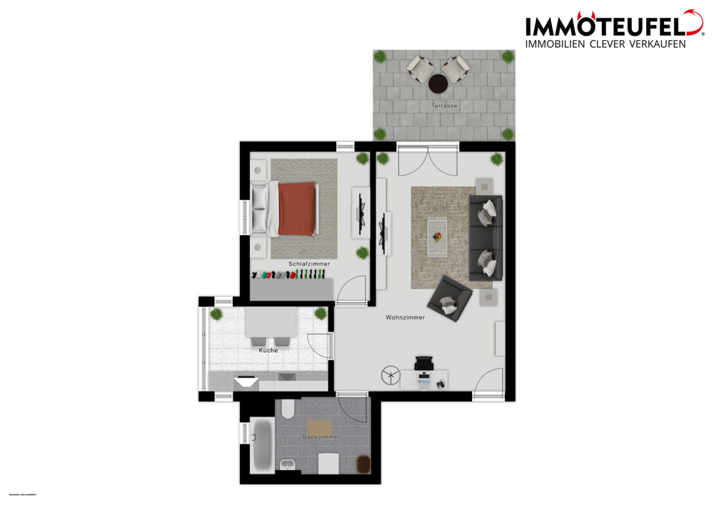 Die Wohnung verfügt über eine helle Küche mit mehreren Fenstern, die für viel Tageslicht sorgen. Das Badezimmer ist mit einem Fenster ausgestattet, bietet eine Badewanne sowie einen praktischen Anschluss für die Waschmaschine. Vom Wohnzimmer aus gelangt man direkt auf die überdachte Terrasse, die sich ideal als geschützter Freisitz nutzen lässt. Das geräumige Schlafzimmer bietet viel Platz für individuelle Gestaltungsmöglichkeiten und eine flexible Möblierung. Außenjalousien sorgen für zusätzlichen Komfort und Privatsphäre. Ein Außenstellplatz gehört ebenfalls zur Wohnung und komplettiert das Angebot.