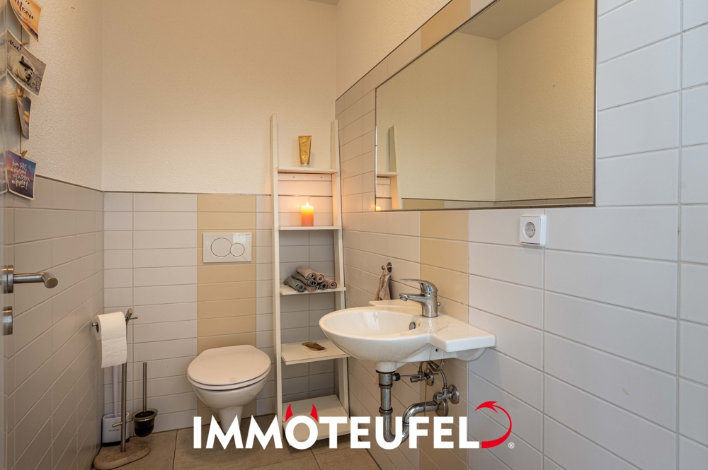Das Schlafzimmer verfügt über ein angrenzendes Ankleidezimmer und ein exklusiv zugängliches Tageslichtbad mit Dusche und Badewanne – ein privater Rückzugsort mit dem Charakter einer Hotelsuite. Wer eine Sauna mag, wird sich freuen, dass für eine Installation bereits alles vorbereitet ist. Ein separates Gäste-WC ergänzt den praktischen Grundriss.