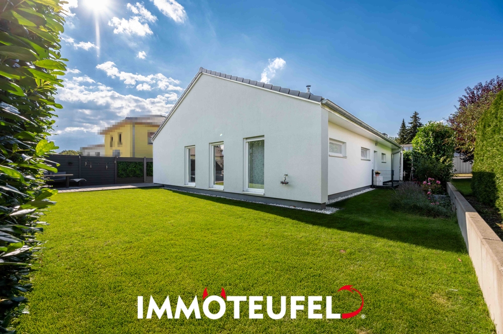 Dieser Bungalow vereint zeitgemäßes Wohnen, Komfort und Energieeffizienz in idealer Weise. Mit insgesamt vier Zimmern bietet er ausreichend Platz für Paare oder Familien. Herzstück ist das große, lichtdurchflutete Wohnzimmer mit Kaminofen und Zugang zur Terrasse, die nahtlos den Wohnraum ins Freie erweitert.