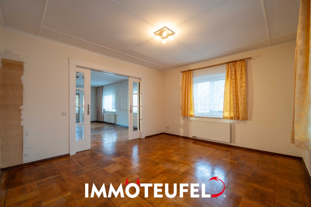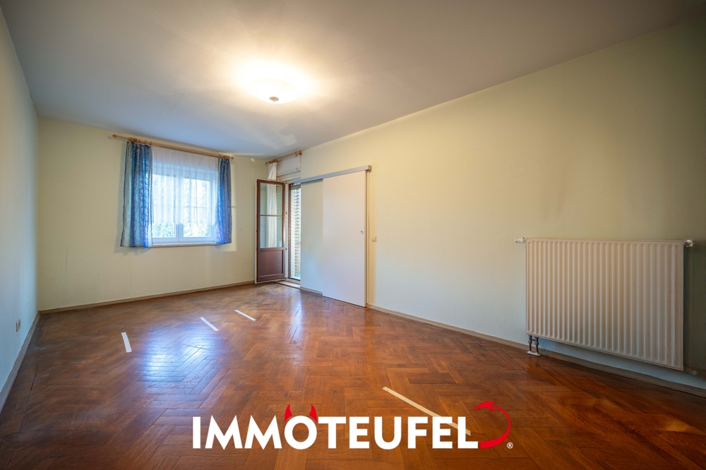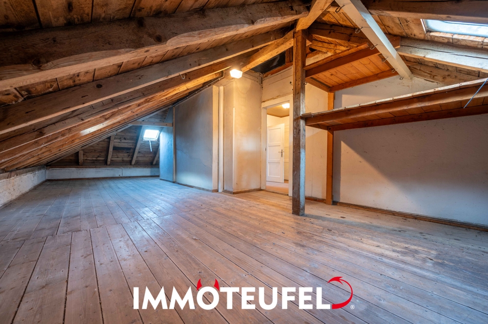 Im Dachgeschoss befinden sich zwei helle Zimmer, die sich hervorragend als Kinder-, Gäste- oder Arbeitszimmer eignen. Zwei weitere Türen führen in den unausgebauten Dachbereich – hier besteht Ausbaupotenzial für zusätzlichen Wohnraum. Das Haus ist vollständig unterkellert und bietet neben Abstellflächen auch einen direkten Zugang zum Garten.