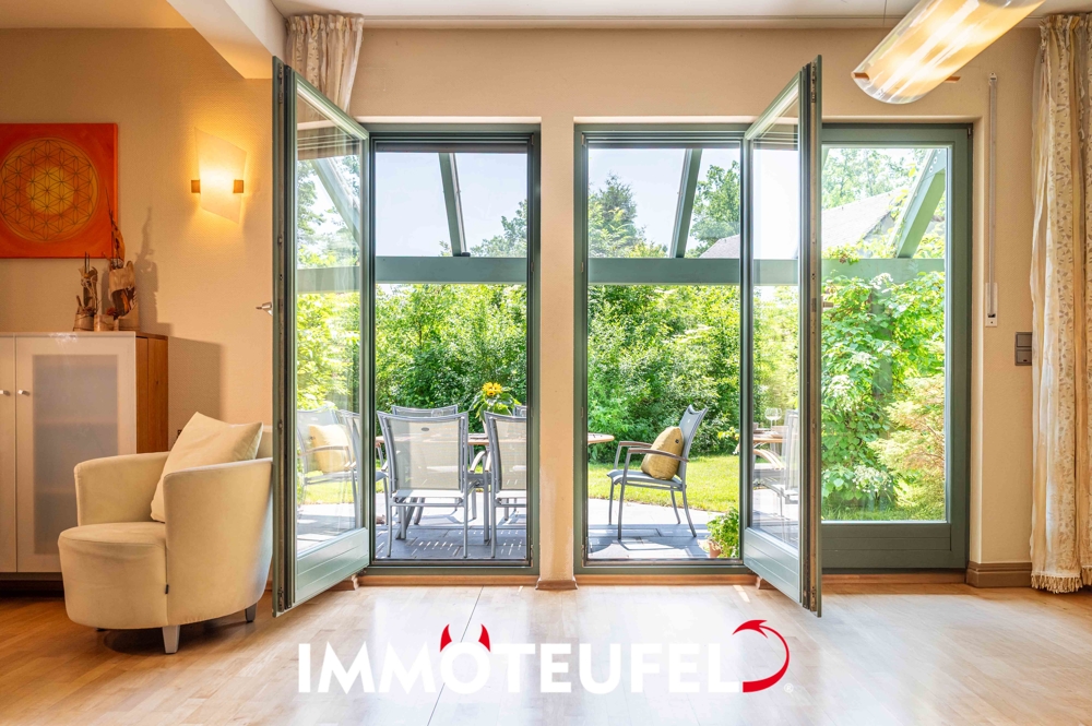 Im Erdgeschoss begrüßt Sie ein freundlicher Eingangsbereich mit Gäste-WC und Dusche – ideal auch für Besucher oder für das schnelle Frischmachen nach einem Spaziergang am Waldrand. Direkt angrenzend befindet sich ein separates Büro – perfekt für das Arbeiten von Zuhause. Die großzügige Küche mit Vorratsraum lädt zum gemeinsamen Kochen und Genießen ein. Ein nahtloser Übergang führt in den lichtdurchfluteten Essbereich und das angrenzende Wohnzimmer. An kühlen Tagen schafft der offene Kamin eine behagliche Wohlfühlatmosphäre im Wohnbereich, während an warmen Tagen der direkte Zugang zur teils überdachten Terrasse das Wohnzimmer nahtlos mit dem Garten verbindet. Die Terrasse selbst lässt sich bei Bedarf durch eine elektrische Markise angenehm beschatten – ideal, um auch bei Sonnenschein komfortable Stunden im Freien zu genießen.