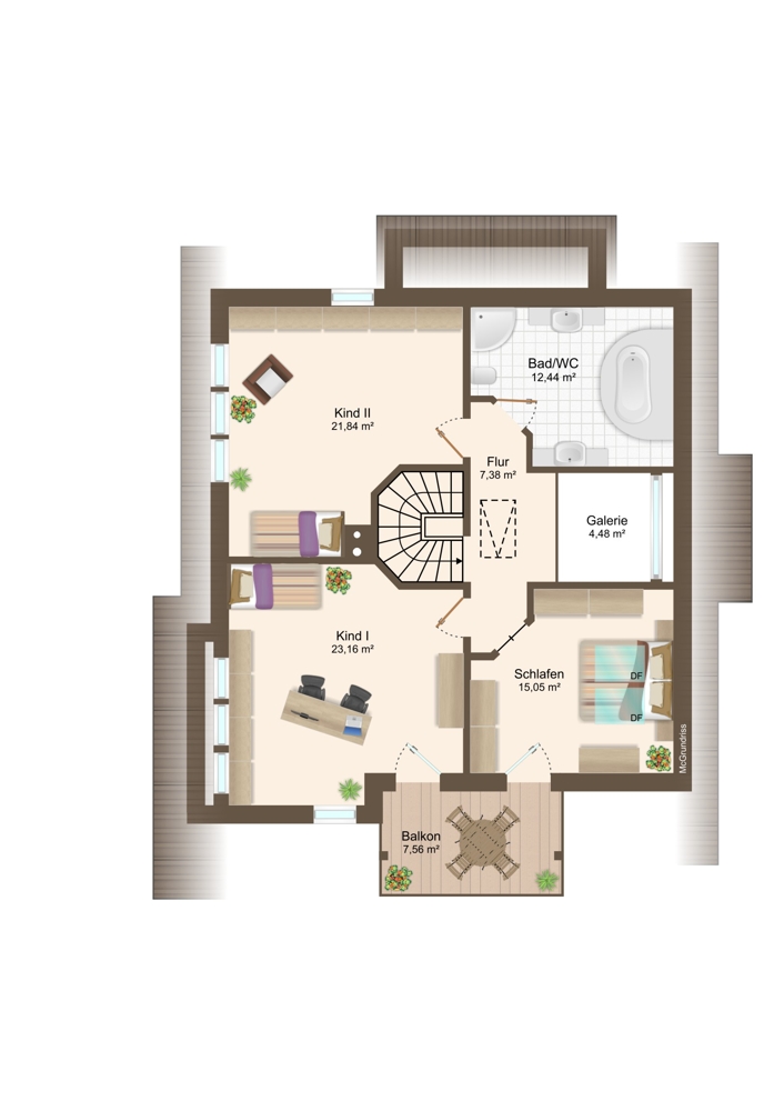 Im Obergeschoss bietet das Haus Raum für die ganze Familie: Zwei große, helle Kinderzimmer, ein Elternschlafzimmer sowie ein geräumiges Badezimmer mit Dusche und Badewanne schaffen einen komfortablen Rückzugsort für jedes Familienmitglied.
