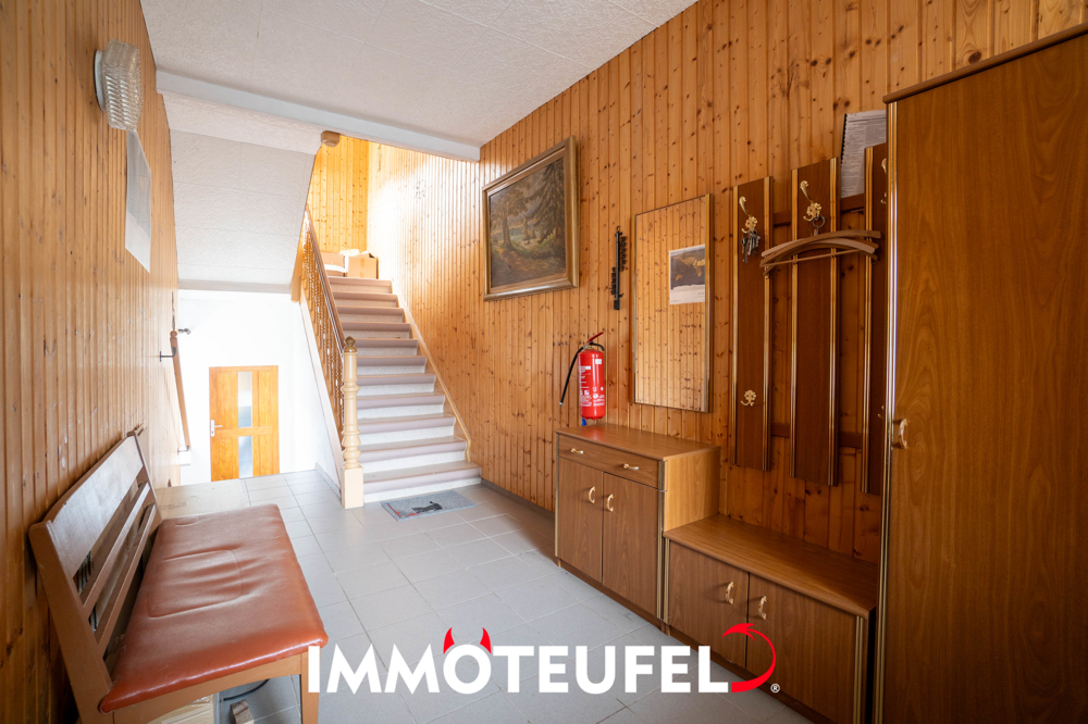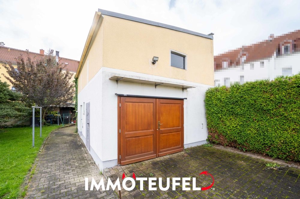 Ein Anbau im Erdgeschoss bietet Zugang zum Grundstück und verfügt über eine Toilette und zwei Abstellräume. Auf dem gepflegten Grundstück selbst befinden sich vier weitere Lagerräume, eine gemütliche Sitzecke für entspannte Stunden im Freien samt idyllischem Teich sowie eine Garage mit Platz für einen PKW. Direkt an die Garage schließt ein Werkstattraum an. Über dieser befindet sich ebenfalls noch ein fünfter Lagerraum.