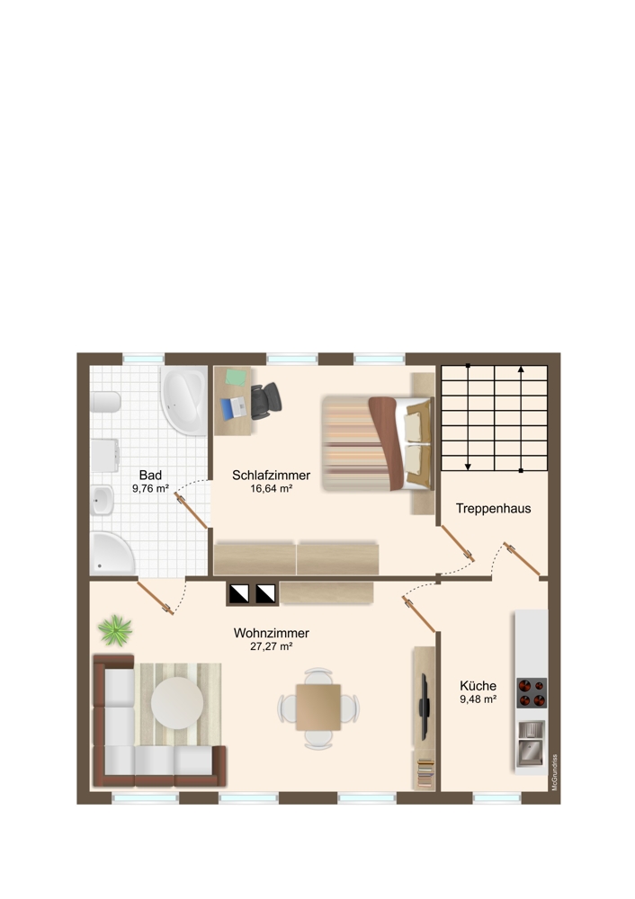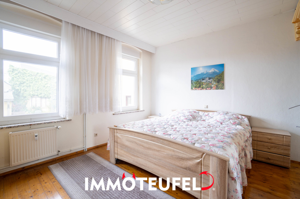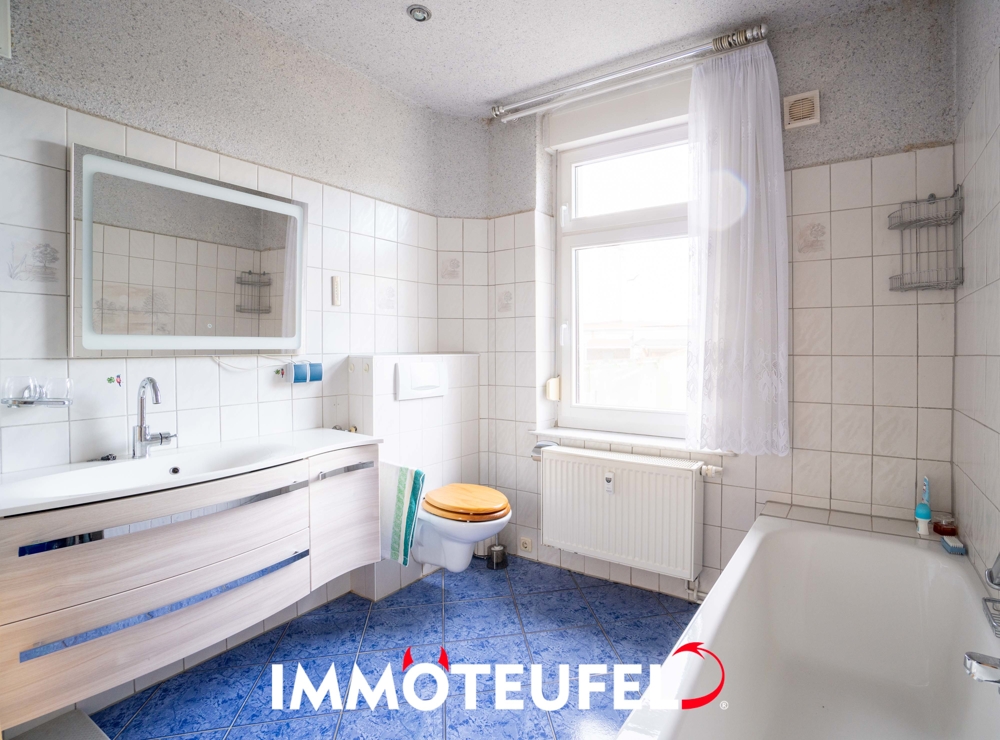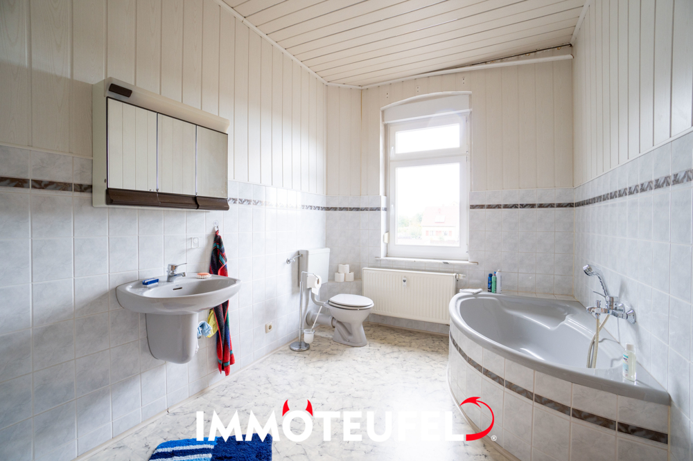 Im Obergeschoss erwartet Sie die zweite Wohneinheit. Die gut aufgeteilte Küche führt in das geräumige Wohnzimmer, das durch seine Größe viel Gestaltungspotenzial bietet. Auch hier gibt es ein Schlafzimmer sowie ein Bad, das mit einer Eckbadewanne, einer separaten Dusche und einem Waschmaschinenanschluss ausgestattet ist. Sämtliche Fenster sind mit Außenrollos versehen. Das Bad und das Schlafzimmer sind zum Grundstück hin ausgerichtet und versprechen ebenfalls eine ruhige Atmosphäre.