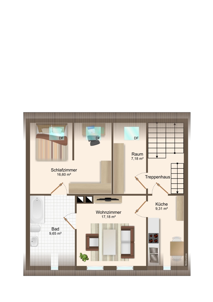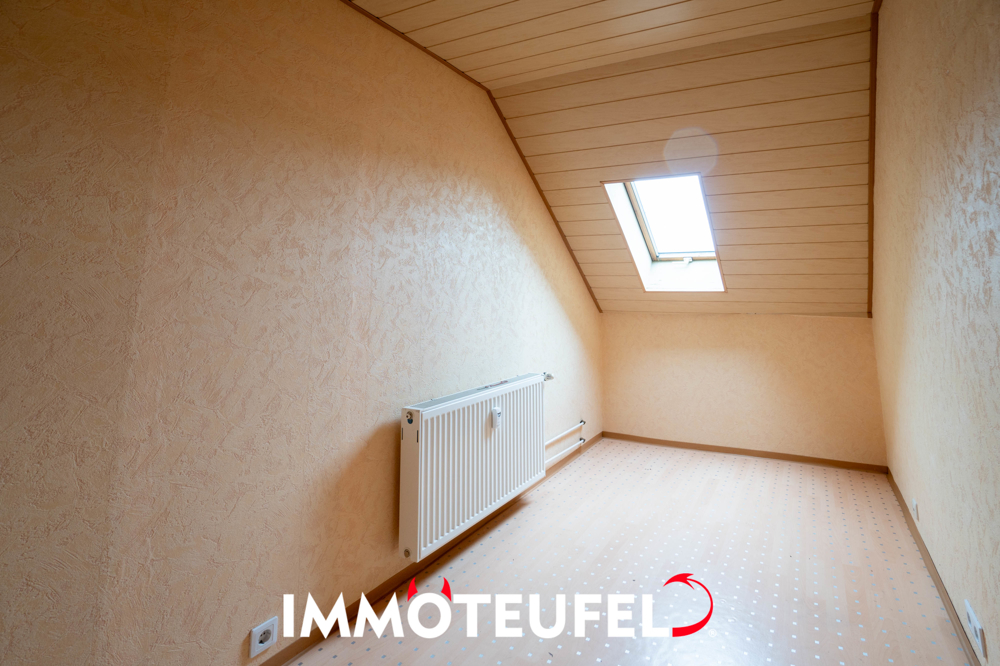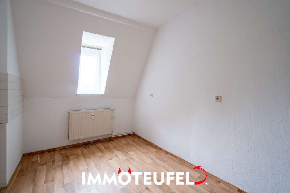 Das Dachgeschoss beherbergt die dritte Wohneinheit des Hauses. Hier gelangen Sie über einen kleinen Flur in ein praktisches Zimmer, das sich ideal als Arbeitszimmer oder Gästezimmer eignet. Weiter geht es in die Küche, die einen direkten Zugang zum hellen Wohnzimmer bietet. Das angrenzende Badezimmer ist mit einer Badewanne und einem WC ausgestattet und beherbergt einen eigenen Warmwasserboiler, der diesen Raum versorgt. Das Schlafzimmer liegt wieder in Richtung des Grundstücks und bietet durch seine Lage Ruhe und Rückzugsmöglichkeiten. Auch hier sind Außenrollos im Wohnzimmer vorhanden.