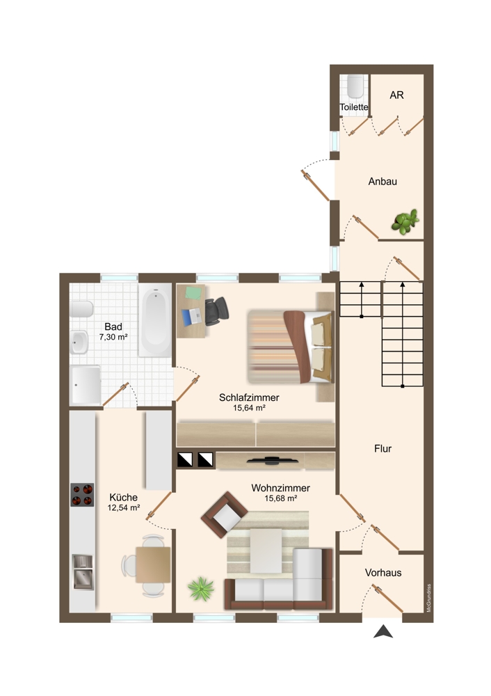 Durch den Hauseingang betreten Sie zunächst ein kleines Vorhaus, das nahtlos in den weiträumigen Flur übergeht. Dieser bietet ausreichend Platz für eine Garderobe und empfängt Sie in einer hellen und freundlichen Atmosphäre. Vom Flur aus gelangen Sie in das einladende Wohnzimmer, das direkten Zugang zur Küche bietet. Die Küche führt weiter in das Badezimmer, das mit einer separaten Dusche, einer Badewanne und einem WC ausgestattet ist. Das angrenzende Schlafzimmer bietet viel Platz für einen großen Kleiderschrank und liegt, wie auch das Bad, in Richtung des Grundstücks – Privatsphäre und Ruhe sind somit garantiert. Alle Wohnräume im Erdgeschoss verfügen über Außenrollos, die zusätzlichen Schutz und Komfort bieten.