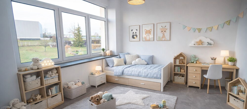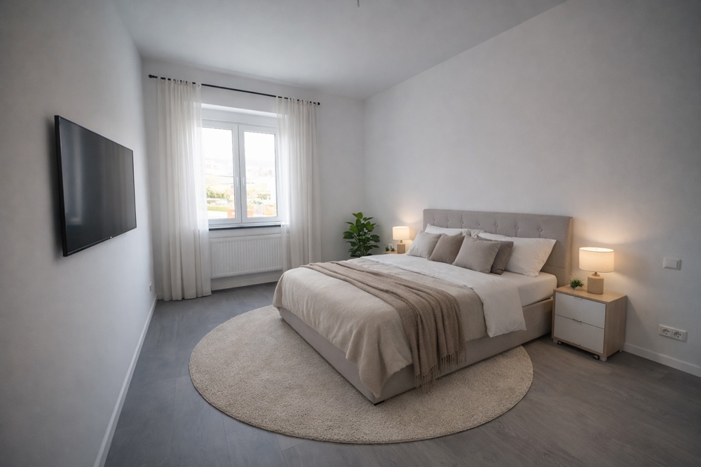 Ein besonderes Ausstattungsmerkmal sind die elektrischen Außenjalousien an den Fenstern, die eine flexible Lichtregulierung, effektiven Sichtschutz und zusätzlichen Wohnkomfort ermöglichen. Die verbauten dreifach verglasten Fenster sorgen zudem für eine hervorragende Wärme- und Schalldämmung. Praktische Steckdosen in den Fensterlaibungen bieten zusätzlichen Komfort, beispielsweise für Beleuchtung oder technische Geräte. Im Wohnbereich sowie im Badezimmer wurden moderne LED-Lichtbänder integriert, die stilvolle Akzente setzen und ein angenehmes, zeitgemäßes Lichtambiente schaffen.