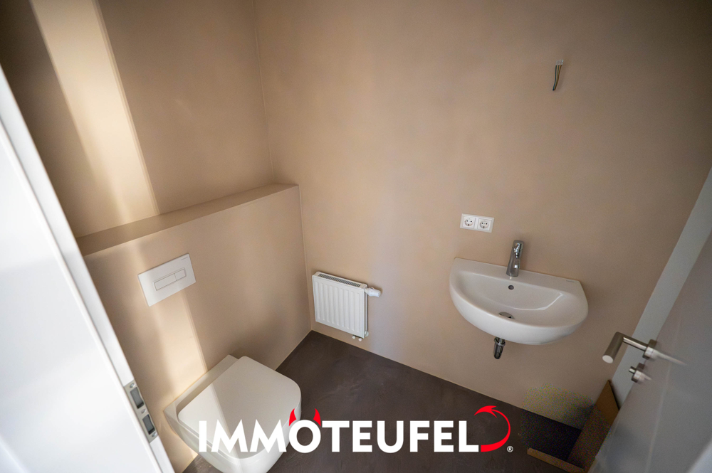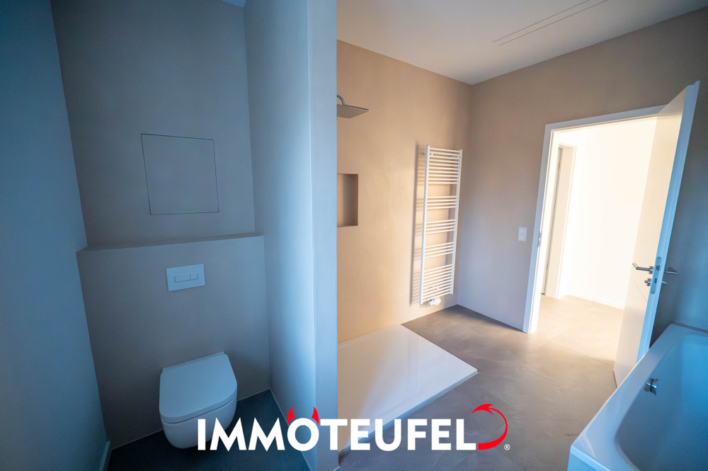 Das Badezimmer überzeugt mit einer besonders hochwertigen Ausstattung. Eine bodentiefe Dusche sowie eine stilvolle Badewanne bieten höchsten Komfort und machen das Bad zu einem Ort der Entspannung. Ergänzt wird das Raumangebot durch ein separates Gäste-WC. Der Waschmaschinenanschluss befindet sich praktisch im Hauswirtschaftsraum, der direkt an die Küche anschließt und zusätzlich ausreichend Abstell- und Stauraum bietet.
