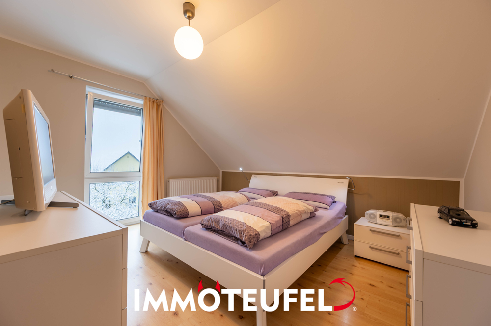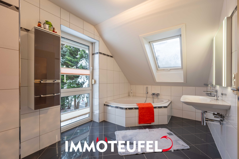 Im Dachgeschoss stehen drei gut proportionierte Zimmer zur Verfügung, die sich ideal als Schlaf-, Kinder- oder Arbeitszimmer eignen. Das Schlafzimmer sowie das Kinderzimmer wurden im Jahr 2020 malerisch renoviert und präsentieren sich entsprechend in einem sehr gepflegten und modernen Zustand. Das großzügige Badezimmer mit Badewanne und WC bietet viel Platz und ist – wie das gesamte Dachgeschoss – mit Dachflächenfenstern ausgestattet, die über elektrische Rollläden verfügen. Zudem verfügt das Bad über eine angenehme Fußbodenheizung, die für zusätzlichen Komfort sorgt. Alle übrigen Fenster des Hauses sind mit Außenjalousien versehen und gewährleisten damit optimalen Sonnen- und Sichtschutz.
