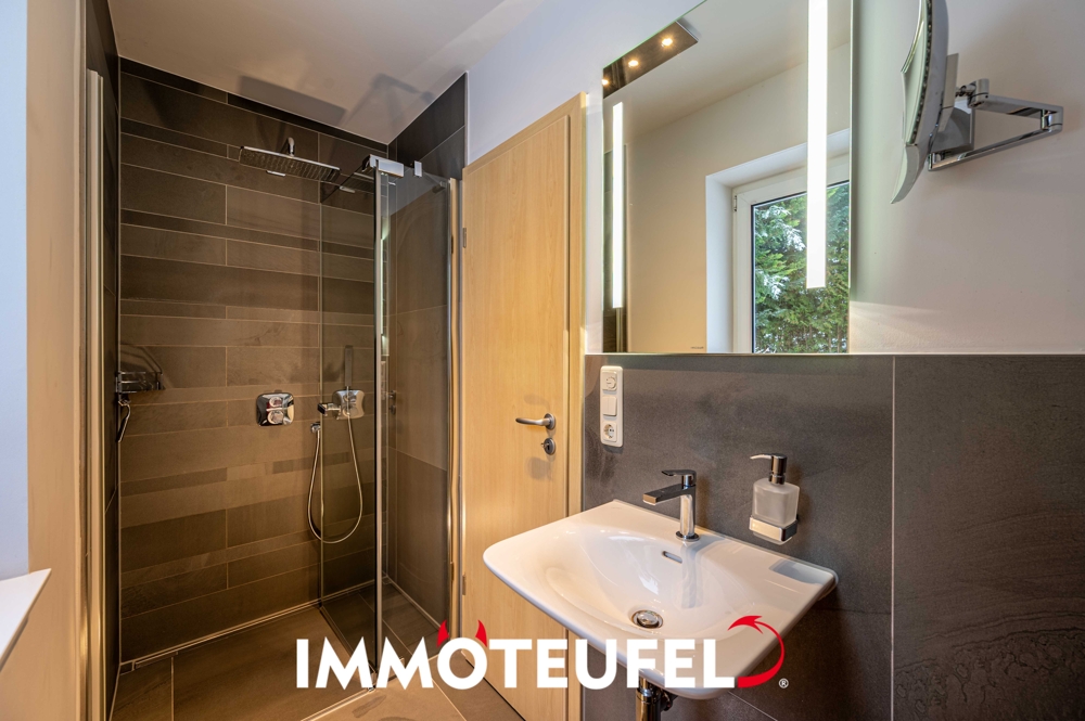 Im Erdgeschoss erwartet Sie eine äußerst angenehme Wohnatmosphäre, die durch die im gesamten Bereich verlegte Fußbodenheizung zusätzlich unterstrichen wird. Der großzügige Wohnbereich wirkt dank der zahlreichen Fensterflächen besonders hell und einladend. Von hier aus haben Sie direkten Zugang zur etwa 40 Quadratmeter großen Terrasse, die einen wunderschönen Blick auf das gepflegte und grüne Grundstück bietet. An warmen Tagen sorgt die elektrische Markise für angenehmen Schatten und zusätzlichen Komfort. Unmittelbar angrenzend befindet sich die Küche, in der 2018 eine moderne, hochwertige Einbauküche installiert wurde. Diese ist mit erstklassigen Geräten ausgestattet, darunter eine integrierte Kaffeevollautomat sowie ein leistungsstarker Heißluft-/Umluftofen – ideal für alle, die Wert auf Qualität und Komfort legen. Das Badezimmer auf dieser Etage ist mit einer Dusche und einem WC ausgestattet und bietet dadurch praktischen Zusatzkomfort.