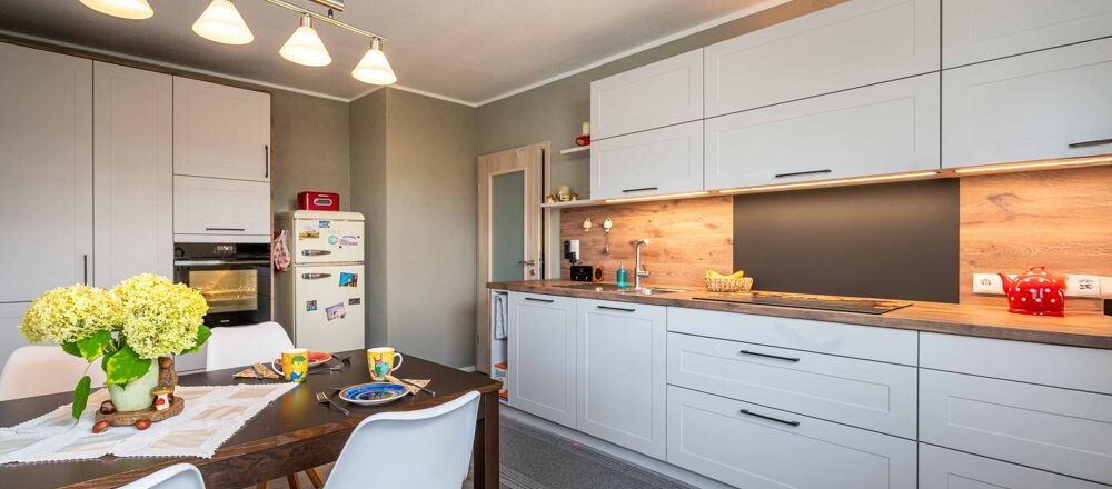 Die moderne, maßgefertigte Einbauküche fügt sich perfekt in den Raum ein und bietet viel Stauraum sowie hochwertige Elektrogeräte – sie ist im Kaufpreis bereits enthalten. Die verbauten zweifach verglasten Kunststofffenster sorgen gemeinsam mit der um 100 mm aufgestockten Dachdämmung für eine gute Energieeffizienz. Im Wohnzimmer sorgt ein neuer Kaminofen mit zugehörigem Edelstahlschornstein für wohlige Wärme und eine gemütliche Atmosphäre.