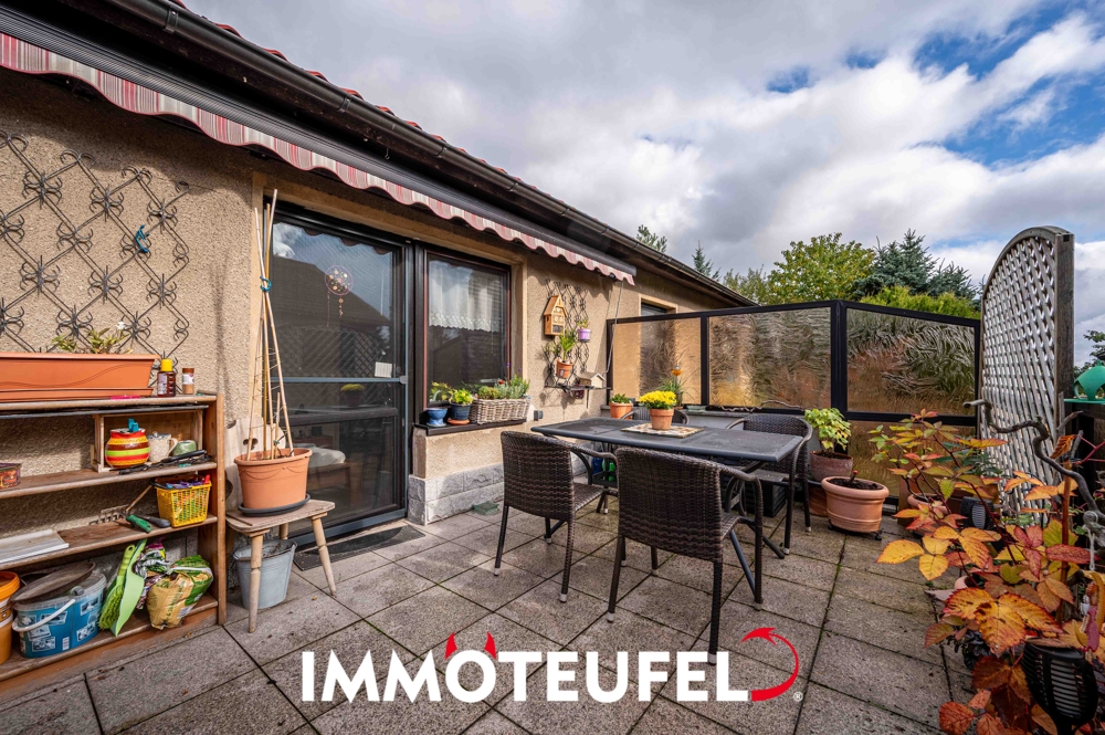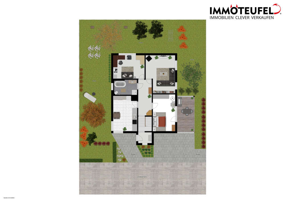 Die Raumaufteilung ist durchdacht und funktional: Vom zentralen Flur aus erreichen Sie sämtliche Zimmer. Die Küche mit gemütlichem Essbereich bietet einen schönen Blick in den Garten, während das gegenüberliegende Schlafzimmer direkten Zugang zur sonnigen Südterrasse hat. Das Wohnzimmer ist hell, freundlich und großzügig geschnitten – ideal, um hier einen behaglichen Mittelpunkt des Hauses zu gestalten. Das Arbeits- oder Kinderzimmer mit Ausrichtung zum Garten bietet Ruhe und Entspannung.