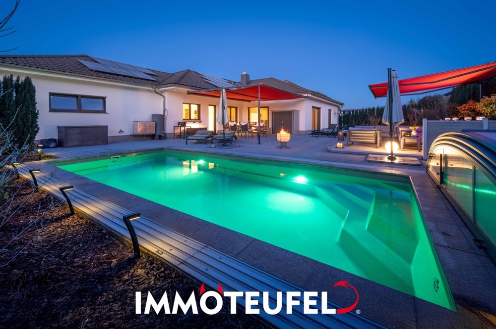 Ein absolutes Highlight der Immobilie stellt die außergewöhnlich großzügige, etwa 80 m² große Terrasse dar. Sie wurde hochwertig ausgestattet und bietet weit mehr als eine klassische Außenfläche: elektrisch gesteuerte Markisen, integrierte Beleuchtung sowie zahlreiche Stromanschlüsse ermöglichen vielfältige Nutzungsmöglichkeiten – vom stilvollen Lounge-Bereich über bis hin zu großen Familienfeiern. Größe, Gestaltung und Nutzbarkeit machen diesen Außenbereich zu einem echten erweiterten Wohnraum im Freien. Der überdachte Pool mit Gegenstromanlage ermöglicht sowohl entspanntes Baden als auch sportliches Schwimmen. Eine Wärmepumpe sorgt für angenehm temperiertes Wasser, während die frostsichere Filteranlage eine komfortable ganzjährige Nutzung vorbereitet.