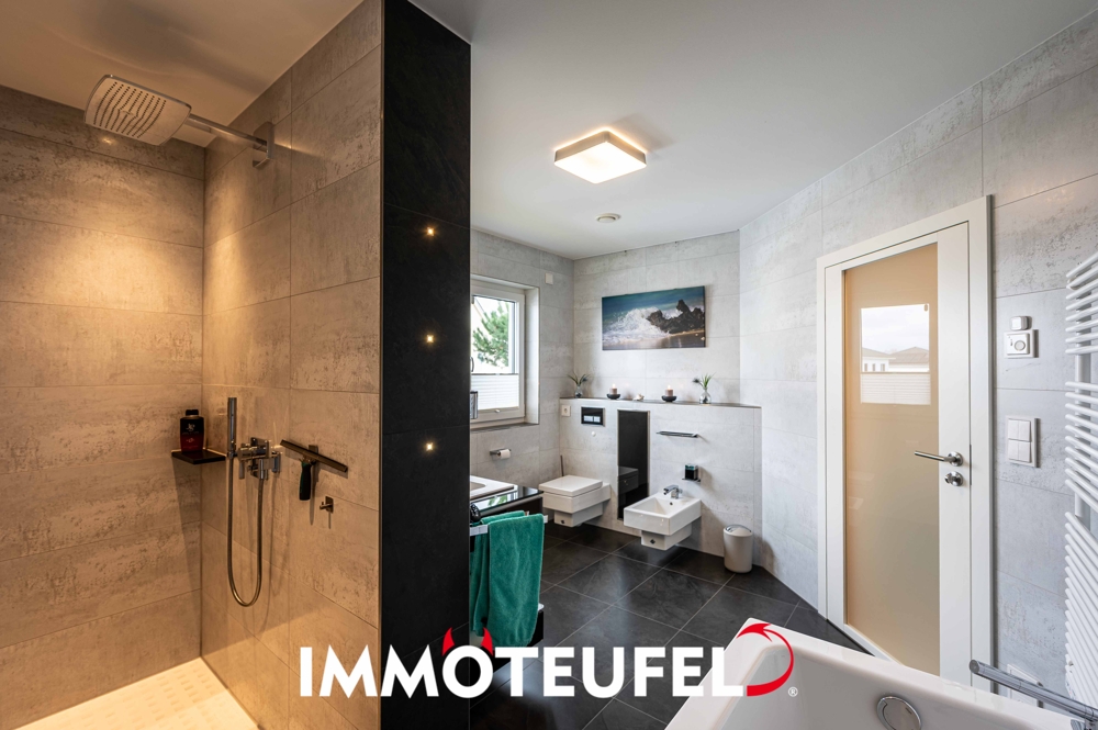 Das großzügige Badezimmer verfügt über Badewanne und Dusche, zusätzlich steht ein separates Gäste-WC zur Verfügung. Eine integrierte Infrarotkabine ergänzt den privaten Wellnesskomfort im eigenen Zuhause.