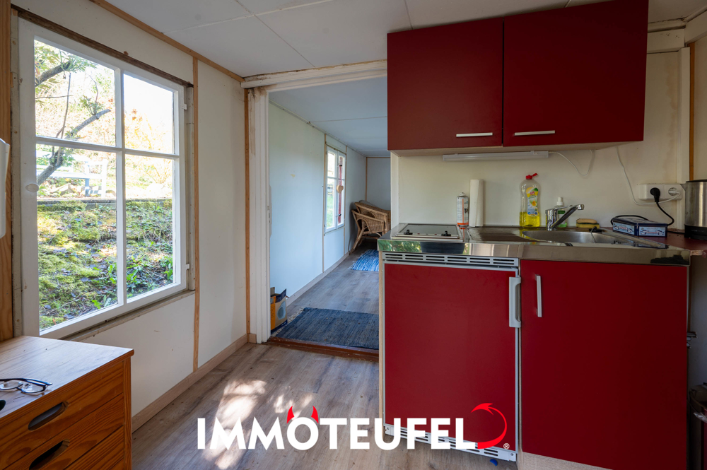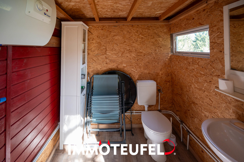 Das Gebäude auf dem Grundstück wurde circa 1987 in Holzbauweise errichtet und bietet auf einer kompakten Fläche einen gemütlichen Erholungsort. Es umfasst ein Zimmer, eine kleine Küche sowie ein WC, was es zu einem idealen Ausgangspunkt für Freizeitaktivitäten oder einen Wochenendaufenthalt macht. Im Jahr 2013 wurde das Dach des Hauses erneuert und gleichzeitig erhielt die Zwischendecke eine Isolierung, wodurch das Gebäude besser gegen Witterungseinflüsse geschützt ist.