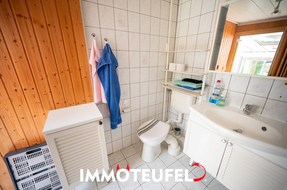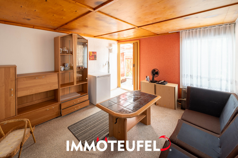 Das Eigentumsgrundstück ist mit einem ca. 1982 errichteten Gartenbungalow in Leichtbauweise bebaut. Dieser bietet eine Wohnfläche von etwa 30 m² mit funktionaler Raumaufteilung: Wohnzimmer, Schlafzimmer, kleine Küche sowie ein separates WC. Eine Dusche ist aktuell nicht vorhanden, eine Anschlusssituation ist jedoch möglich. Der angrenzende Wintergarten erweitert den Wohnbereich und ist mit einer elektrischen Fußbodenheizung ausgestattet – ideal für die Übergangszeiten und kühle Abende.