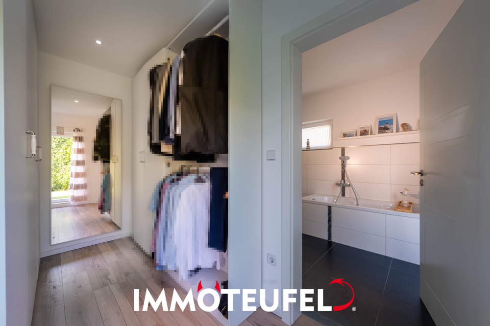 Das Schlafzimmer verfügt über ein angrenzendes Ankleidezimmer und ein exklusiv zugängliches Tageslichtbad mit Dusche und Badewanne – ein privater Rückzugsort mit dem Charakter einer Hotelsuite. Wer eine Sauna mag, wird sich freuen, dass für eine Installation bereits alles vorbereitet ist. Ein separates Gäste-WC ergänzt den praktischen Grundriss.