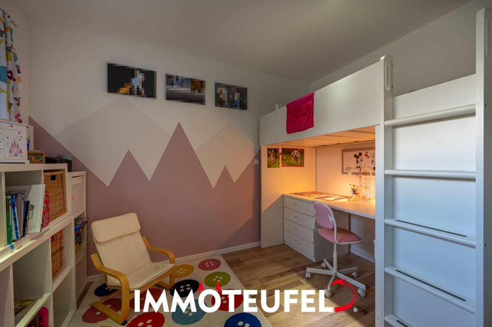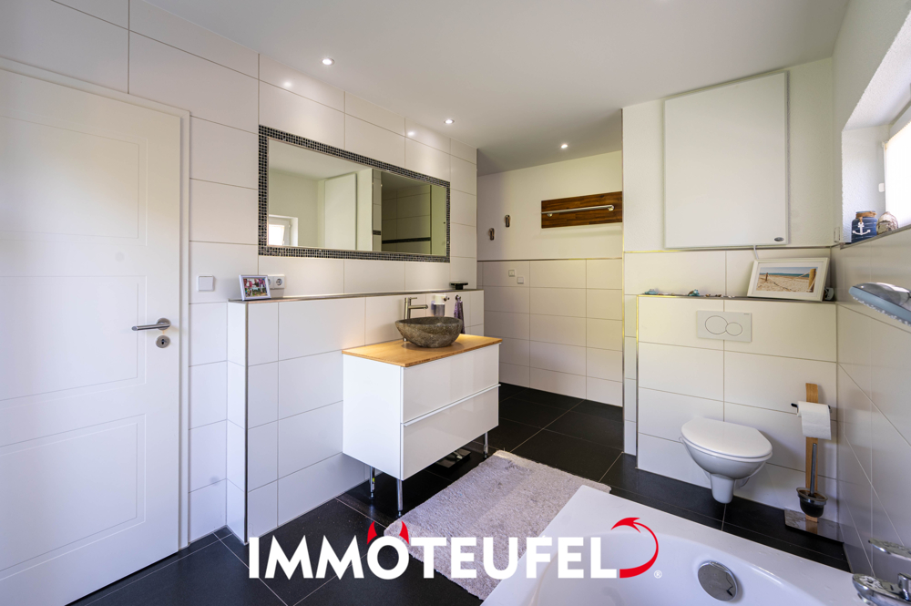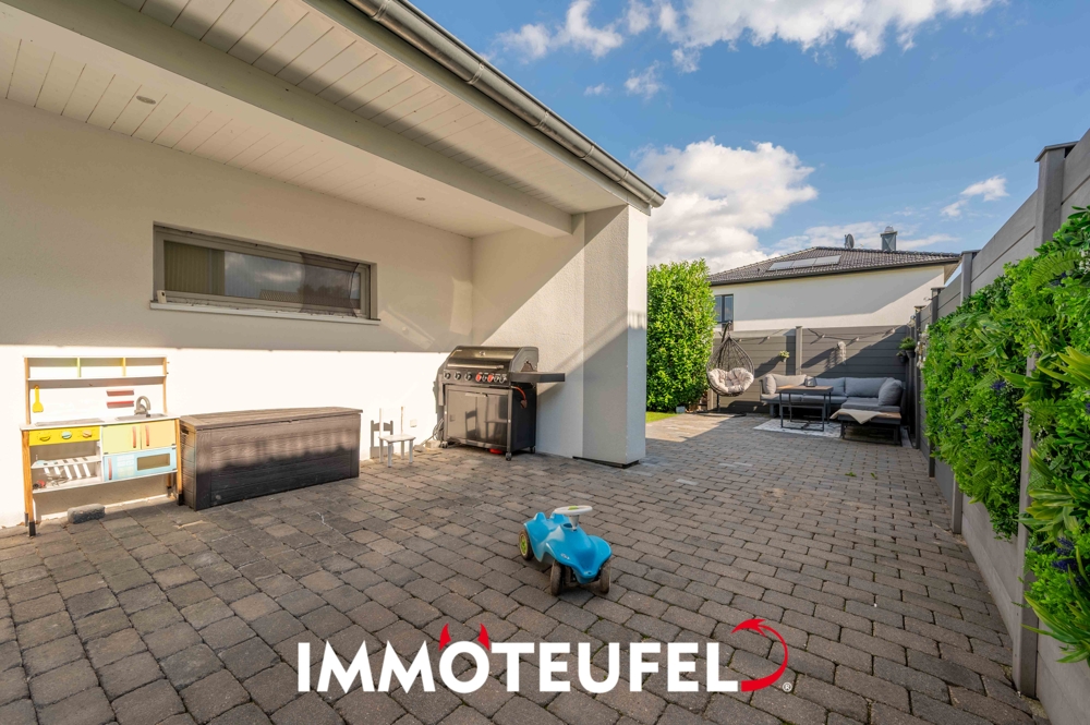 Besonderen Wohnkomfort schaffen die hochwertige Ausstattung und durchdachte Details: Außenjalousien an allen bodentiefen Fenstern sorgen für Beschattung und Sicherheit, die Gaszentralheizung mit Solarthermie wird durch einen Kamin im Wohnbereich unterstützt und eine Photovoltaikanlage auf dem Dach ermöglicht die Eigenstromversorgung. Zusätzlich steht ein großzügiger Dachboden als Stauraum zur Verfügung.
