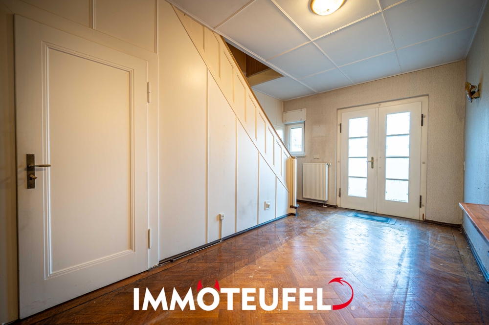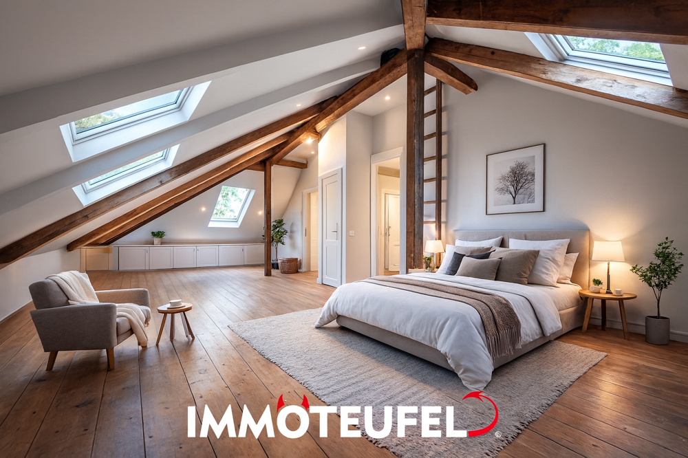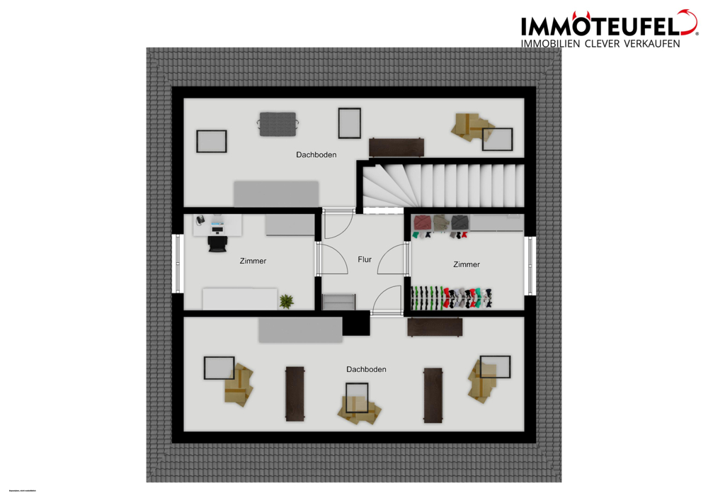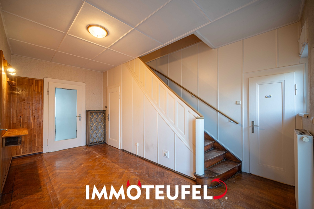 Im Dachgeschoss befinden sich zwei helle Zimmer, die sich hervorragend als Kinder-, Gäste- oder Arbeitszimmer eignen. Zwei weitere Türen führen in den unausgebauten Dachbereich – hier besteht Ausbaupotenzial für zusätzlichen Wohnraum. Das Haus ist vollständig unterkellert und bietet neben Abstellflächen auch einen direkten Zugang zum Garten.