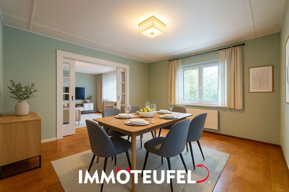 Im Erdgeschoss empfängt ein großzügiger Eingangsbereich, von dem aus alle Räume zentral begehbar sind. Die Küche verfügt über eine praktische Speisekammer. Der Essbereich ist durch eine klassische Schiebetür mit dem Wohnbereich verbunden. Der weitläufige Wohnraum öffnet sich zur Terrasse mit Blick ins Grüne – ideal für Familien und Gäste. Ein separates Schlafzimmer mit direktem Zugang zum Bad sowie ebenfalls zur Terrasse schafft zusätzlichen Komfort.